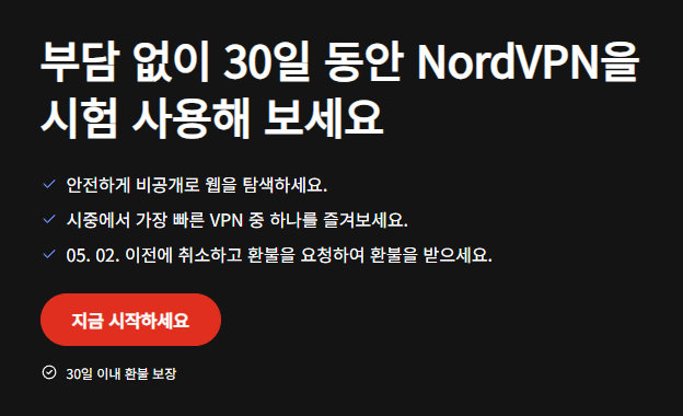 참고로 NordVPN은 30일 환불 정책을 운영 중인데요. 이때 본인 스타일과 맞지 않는다면 기한 내에 환불을 선택하는 것이 현명합니다.