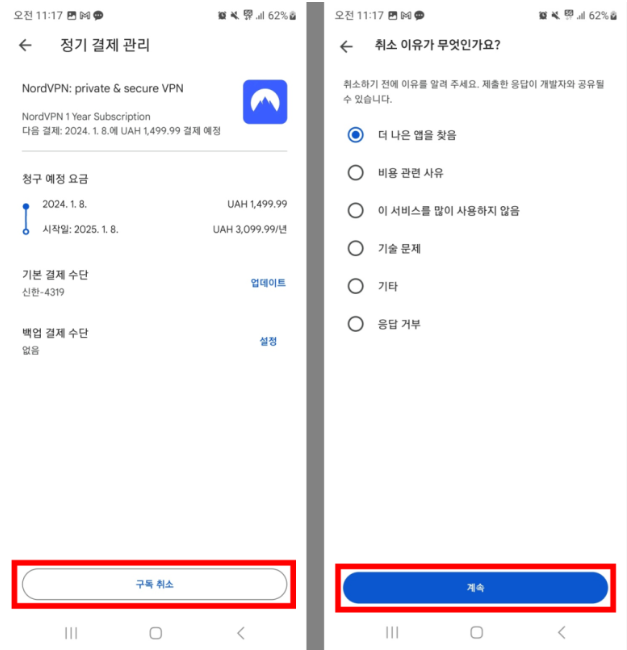 만약 구글 플레이로 결제했다면 구글 계정의 결제 내역에서 NordVPN 항목을 선택한 뒤 ‘문제 신고’ 또는 ‘환불 요청’을 통해 접수해야 합니다.